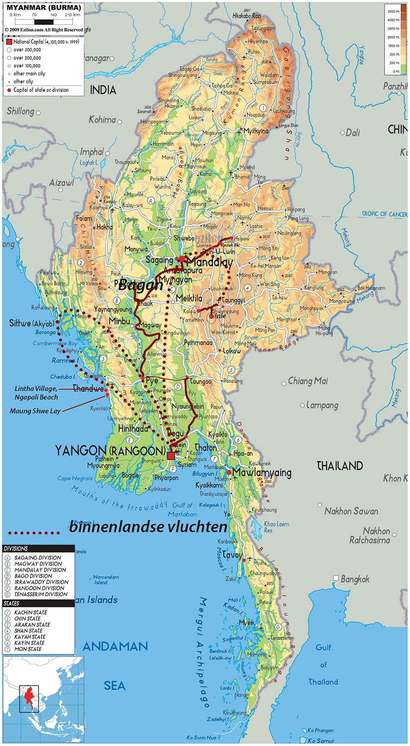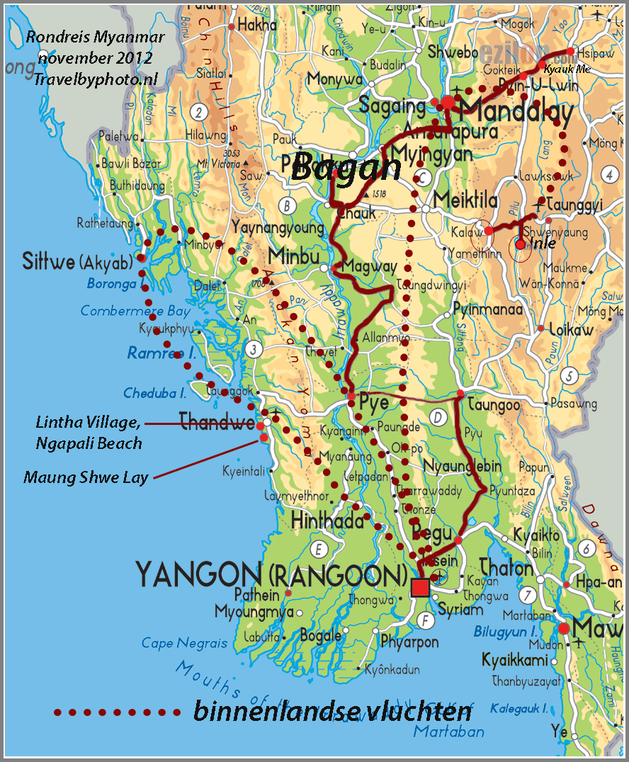 Op tijd op en ontbijt in het hotel. Aung Win wacht ons voor het hotel op met zijn auto voor de rit naar Toungoo detailkaart van Myanmar